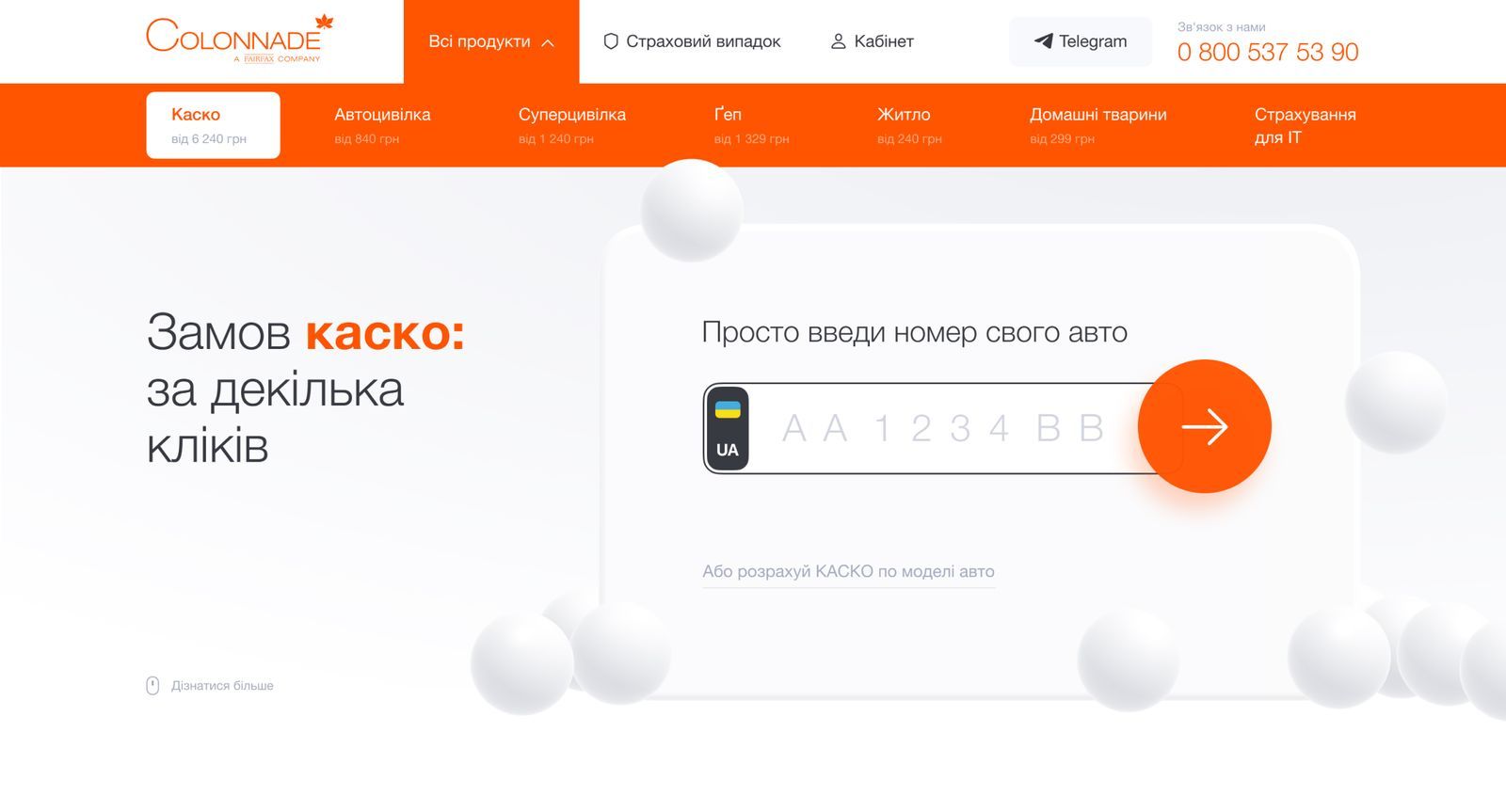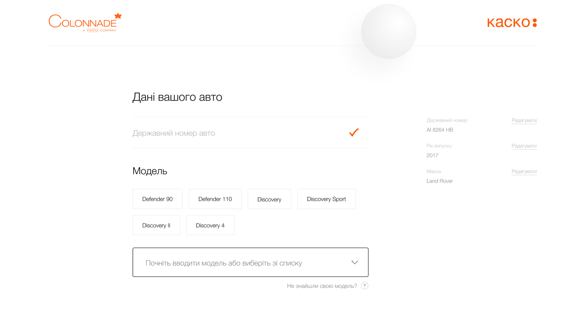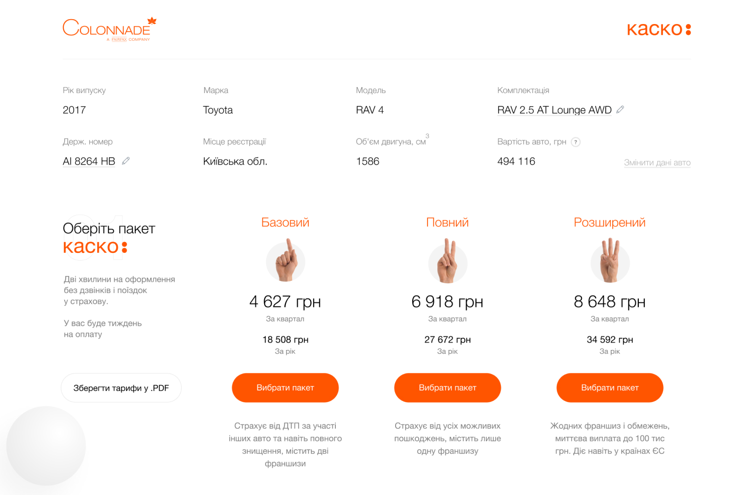 Right on the first screen, you can enter the car number and calculate the cost of a CASCO in a second.